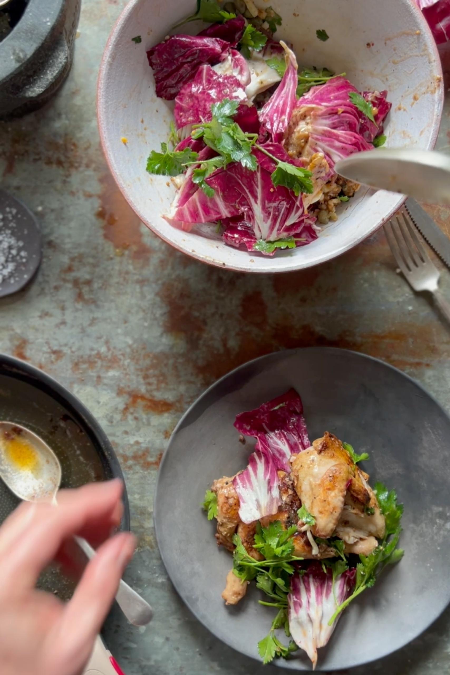 Split the chicken into 8 pieces, each breast into 2 pieces and each leg into a drumstick and a thigh. Place into a mixing bowl along with the radicchio, toasted walnuts, baby beets, flat leaf parsley and boiled egg dressing. Toss gently and serve immediately